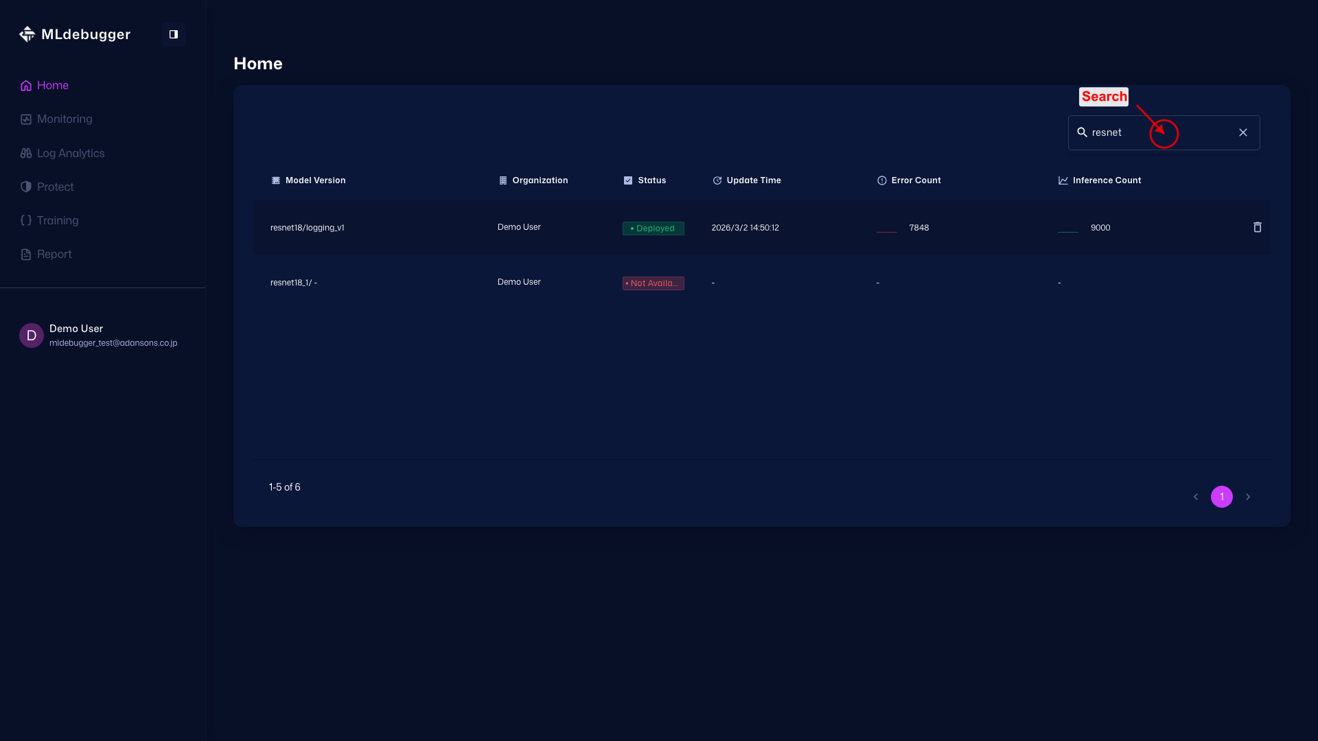 Start from the model and version list and move to pages such as Monitoring / Log Analytics / Training / Report.