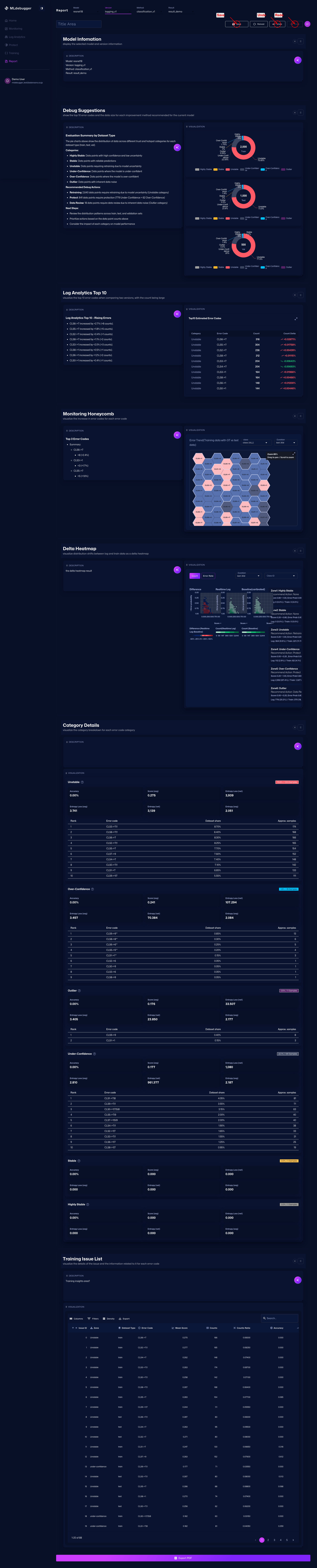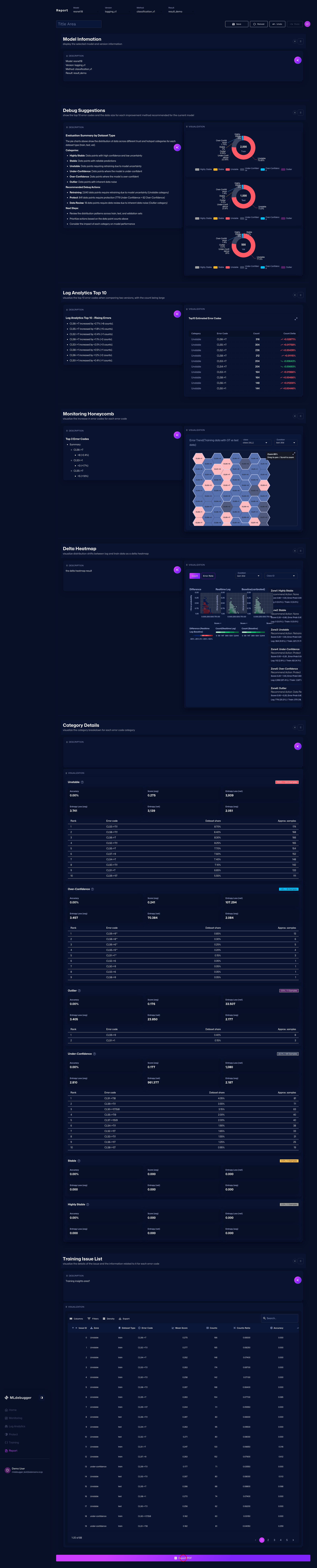 This screen lets you create a report by combining multiple sections and export it in formats such as Markdown or PDF.