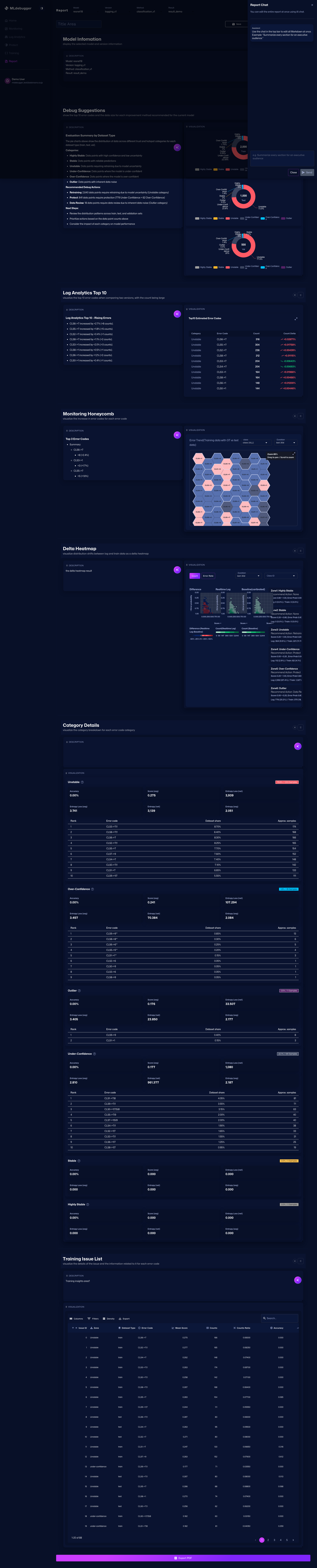 Edit the report in a Markdown editor and export it as a PDF. Section reordering, AI-assisted writing, and PDF export are available.