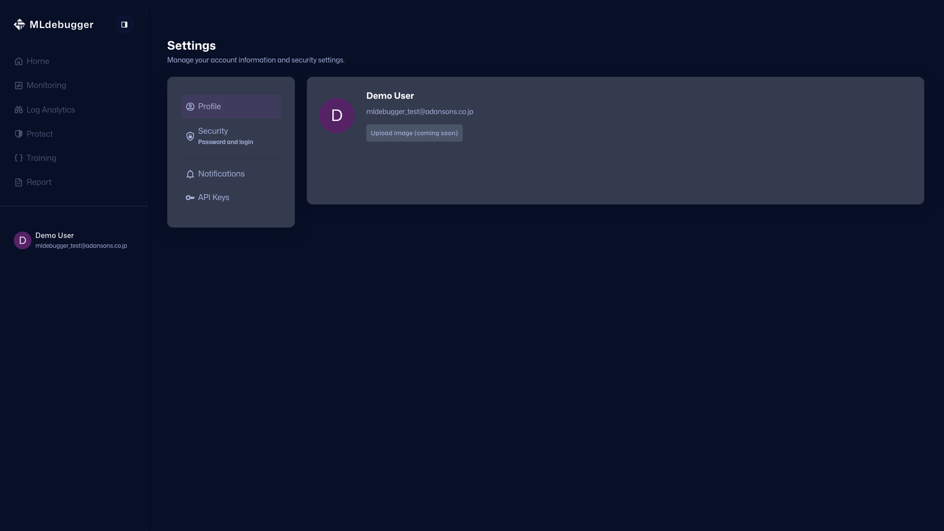 In the Profile section, you can review the avatar, username, and email address. The image upload flow is still under preparation.