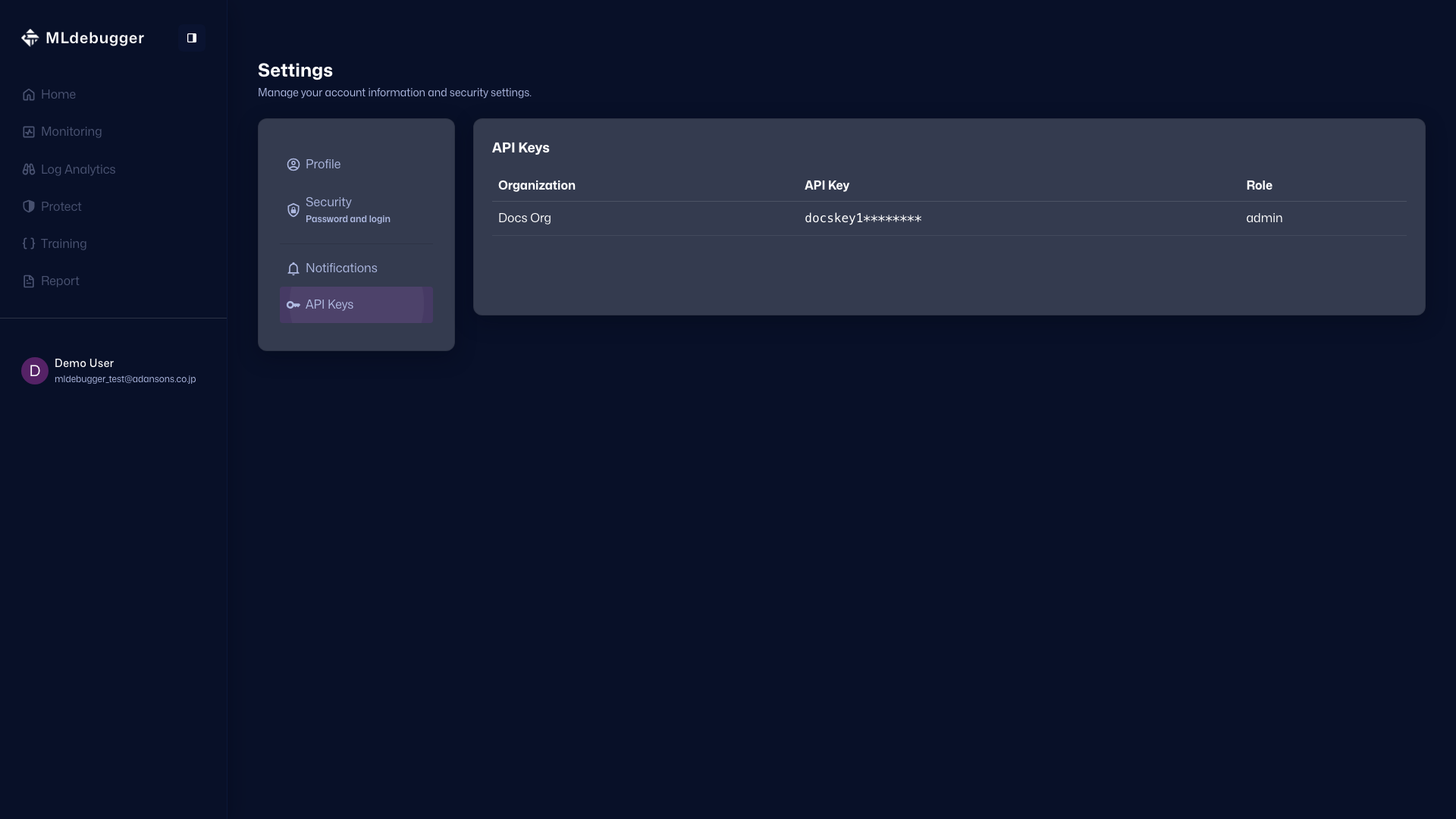In the API Keys section, you can review the API Key prefixes and roles for each organization. The full key is not shown; only the prefix is displayed.
