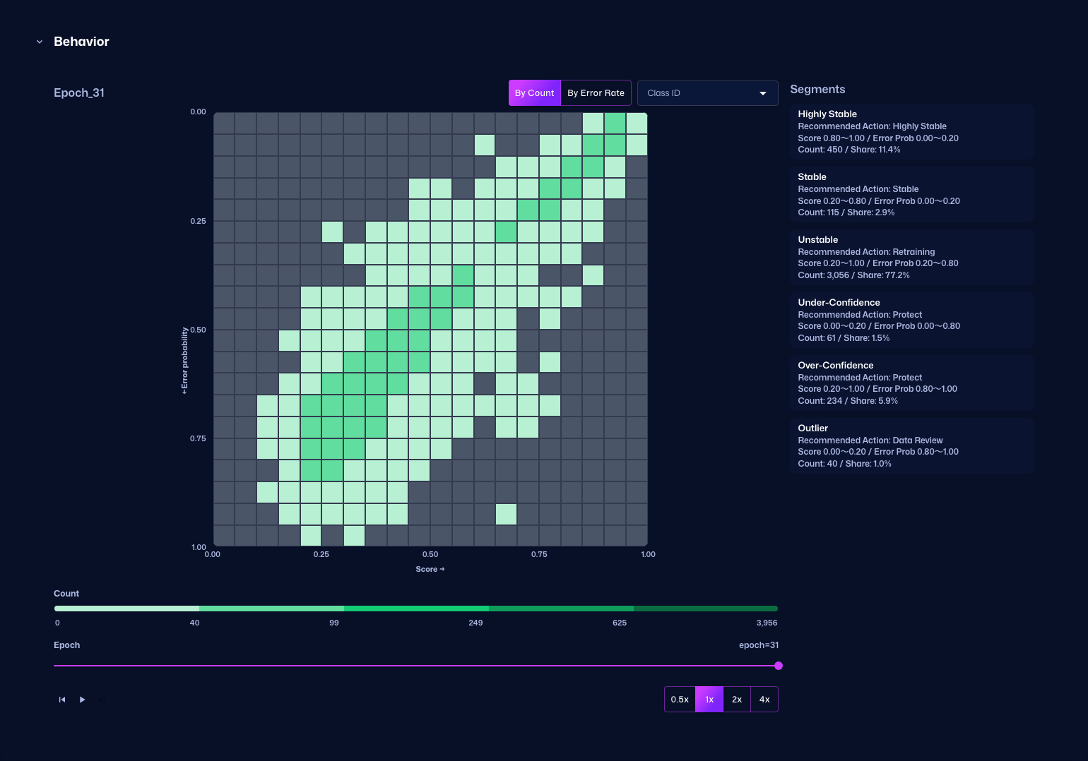 This section displays the relationship between Score and Error Probability as a heatmap. You can switch between By Count and By Error Rate modes.