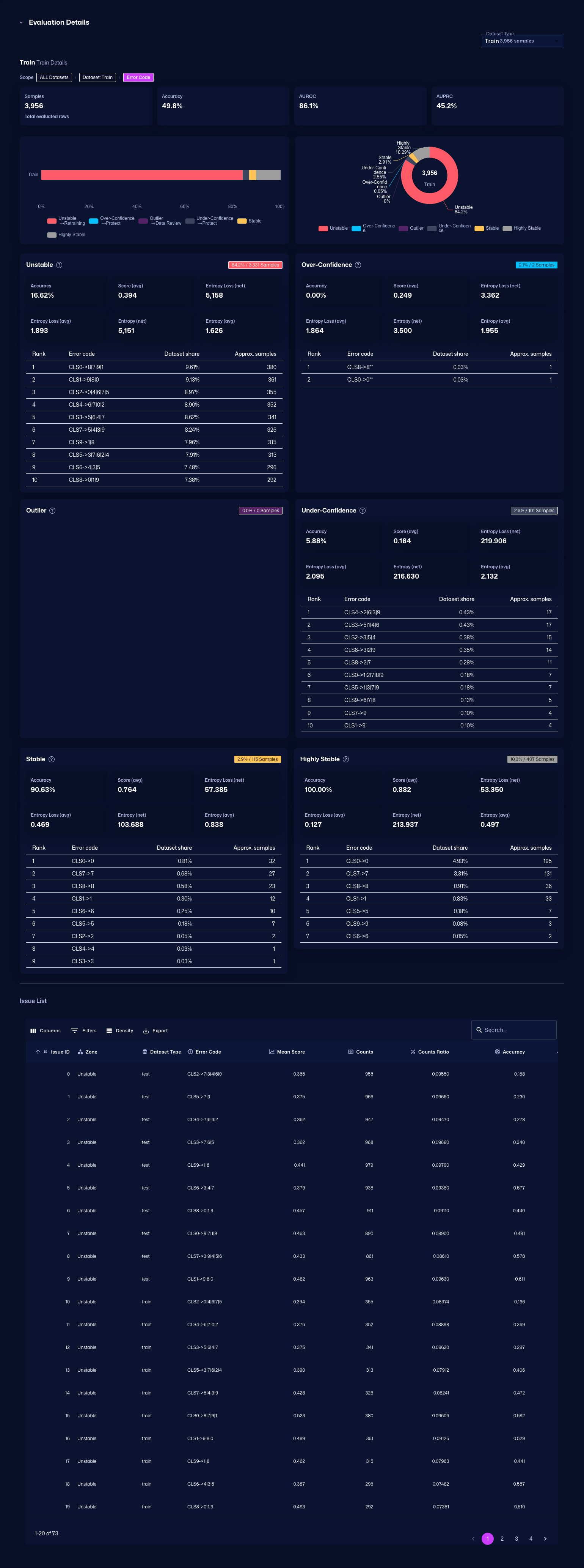 Displays detailed evaluation for each class. Use the Issue List to inspect problems by class.