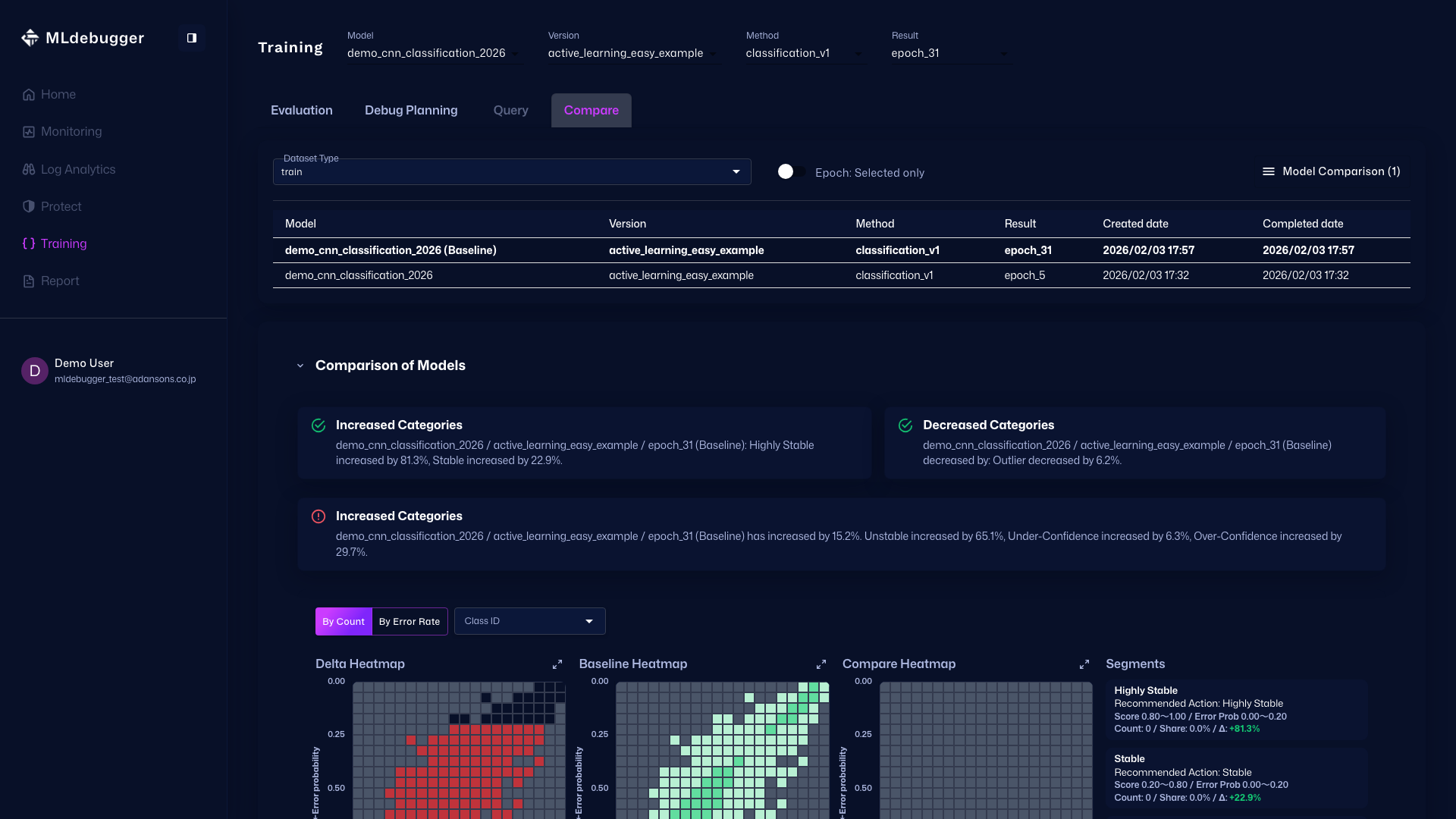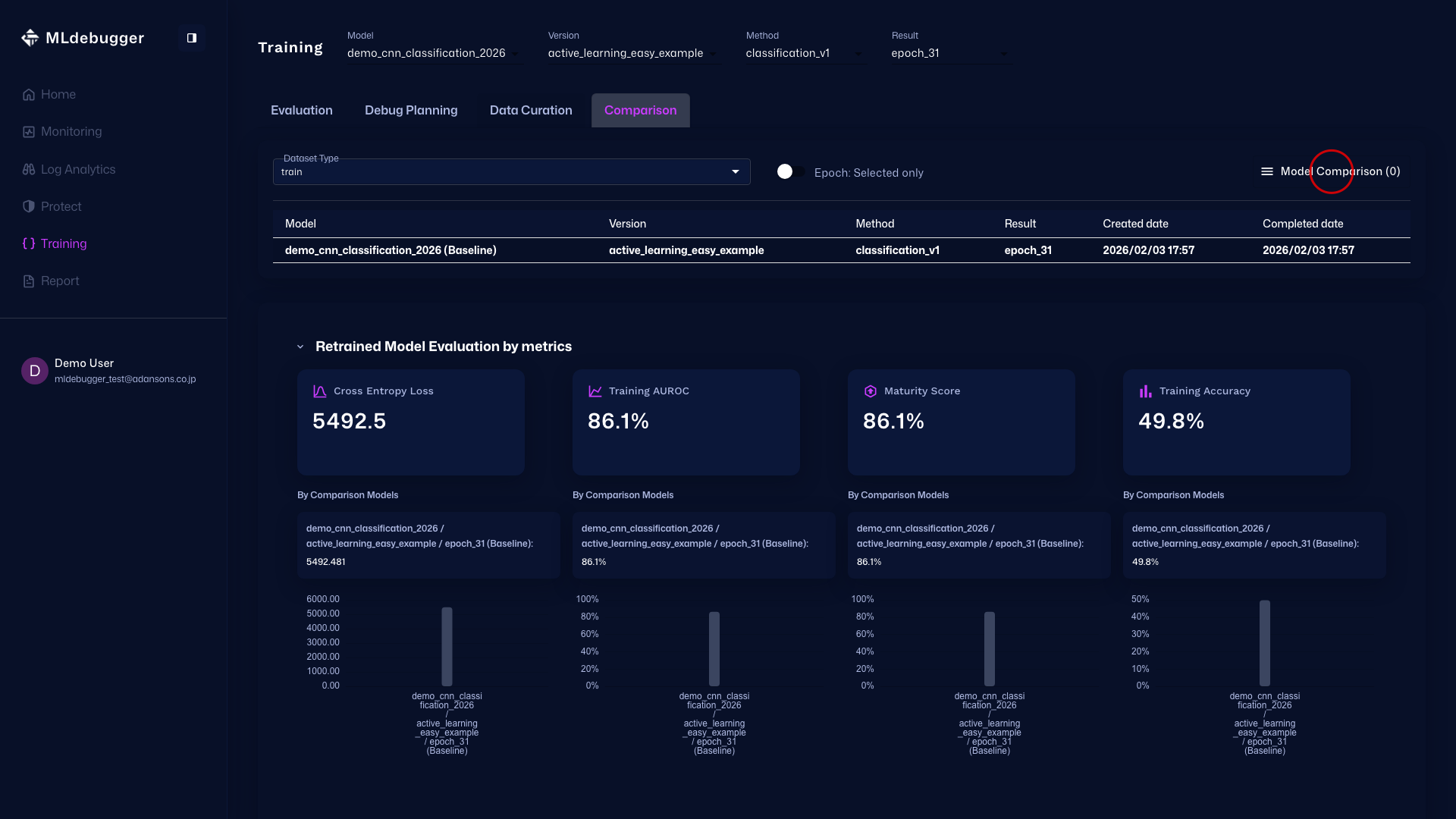 The Compare tab compares other models or epochs and evaluates baseline performance relatively.