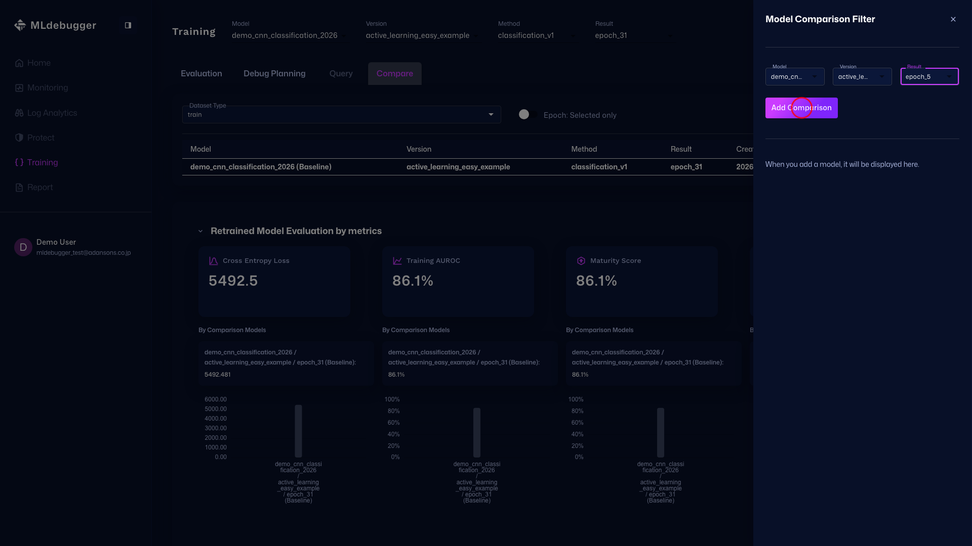 In this drawer, select the comparison target Model / Version / Result and add it with the Add Model Comparison button.