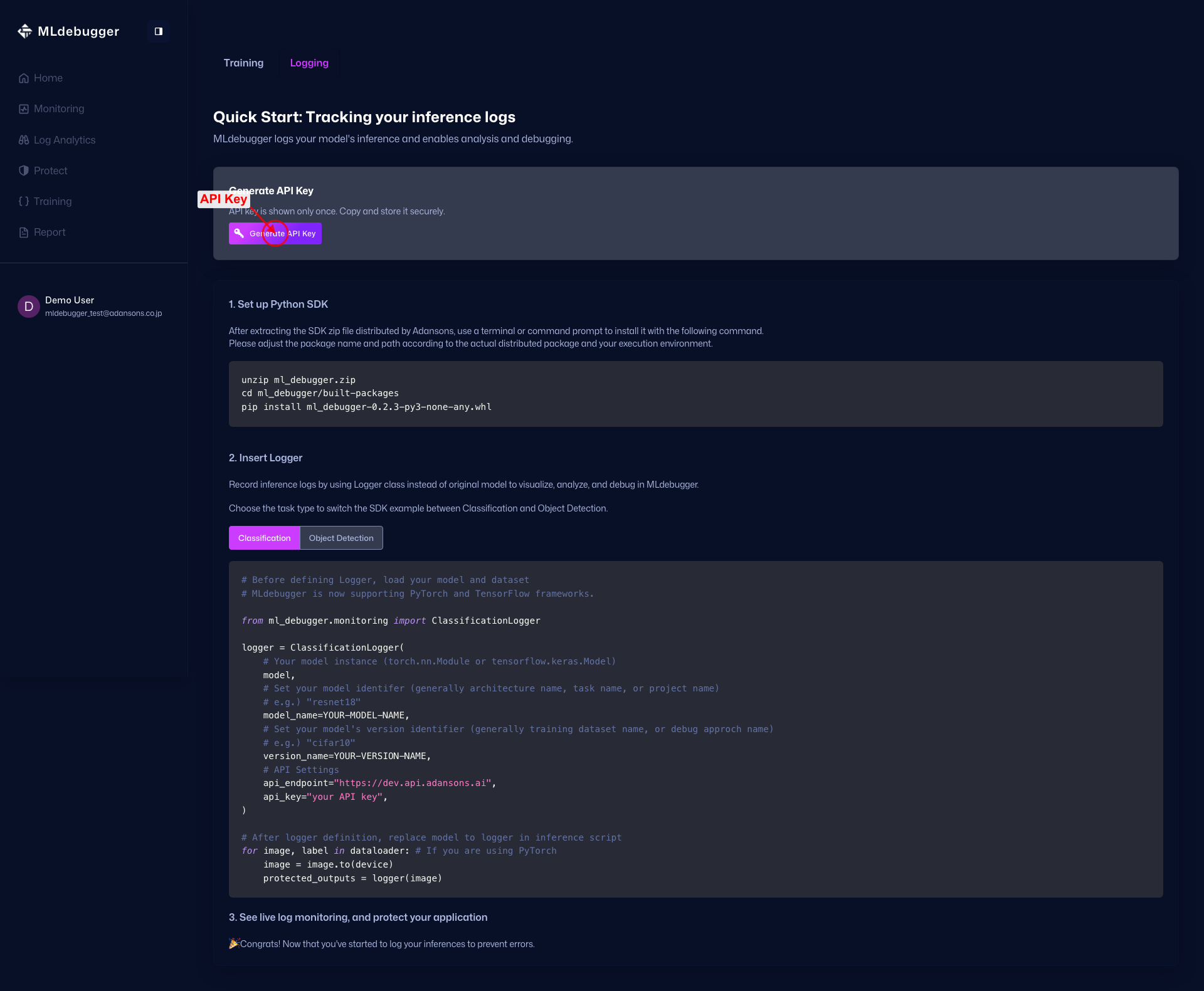 Provides Training / Logging guide switching and a button for generating an API Key.