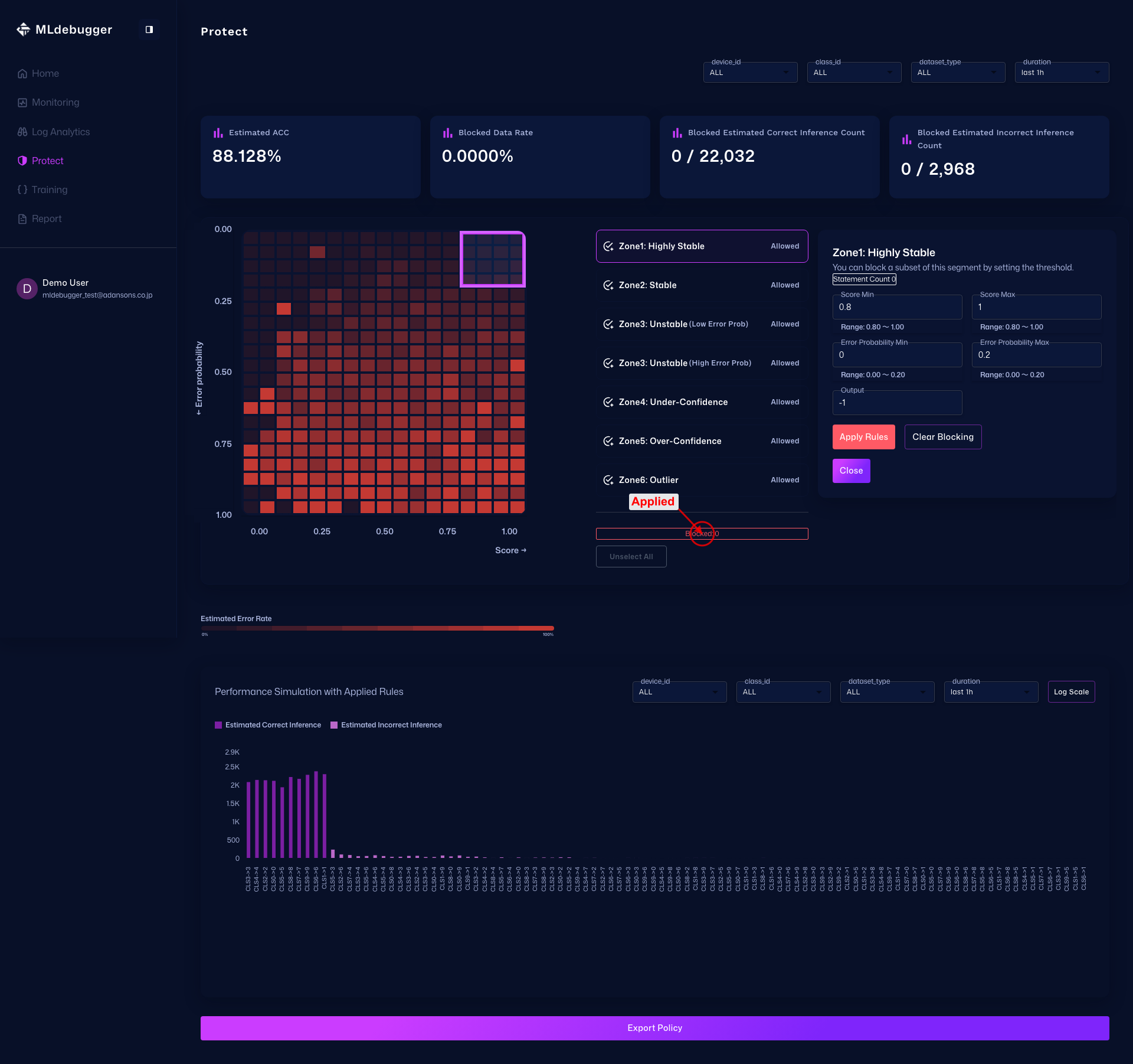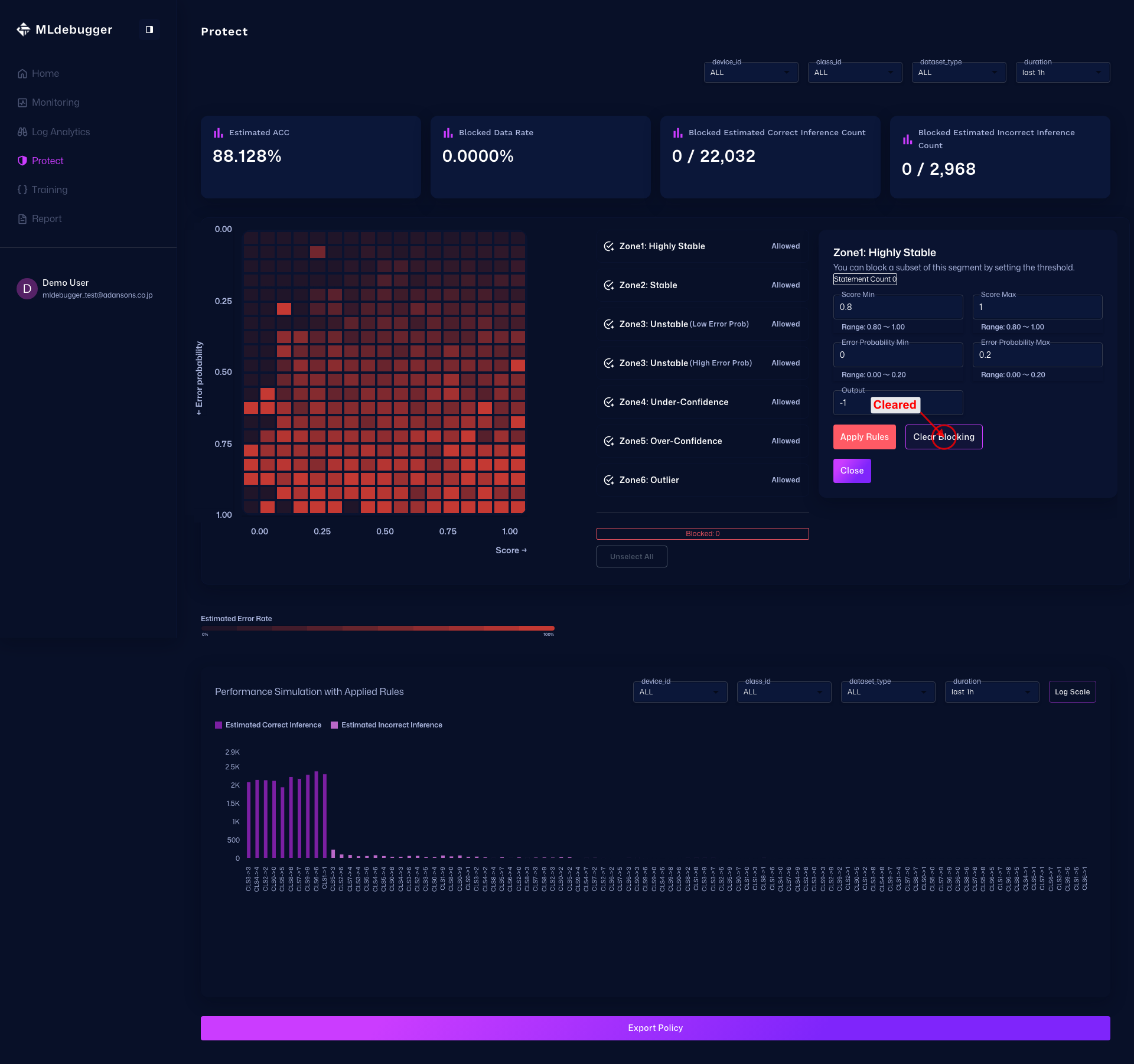スコア/エラー確率の分布からセグメントを選び、ブロック条件(ポリシー)を作成する画面です。デモモードでのみ有効な箇所があります。