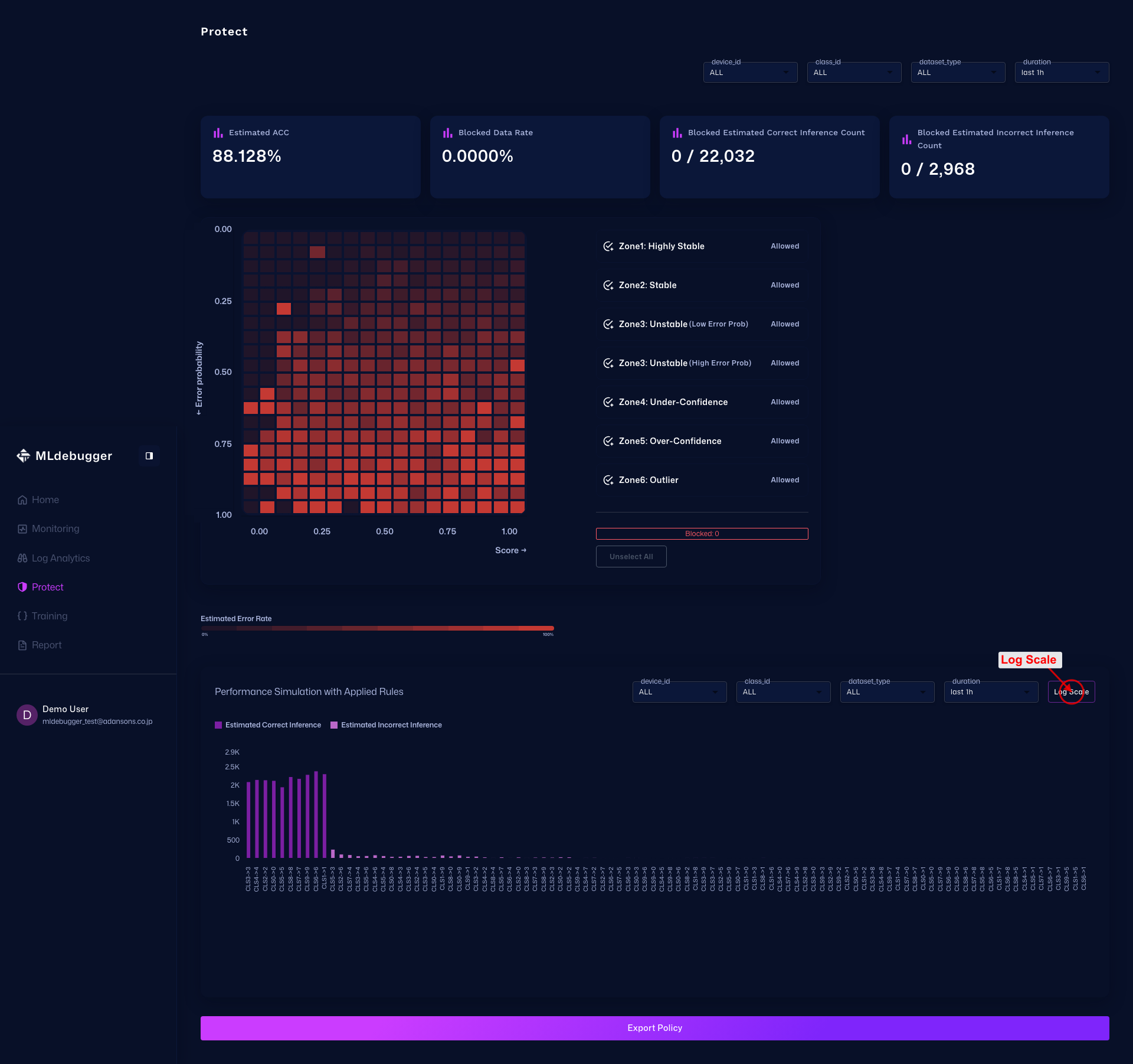 メトリクスカードでブロック影響を確認し、Heatmap / Zone編集 / Performance Simulation(Log Scale切替)を用いて条件適用時の挙動を検証します。