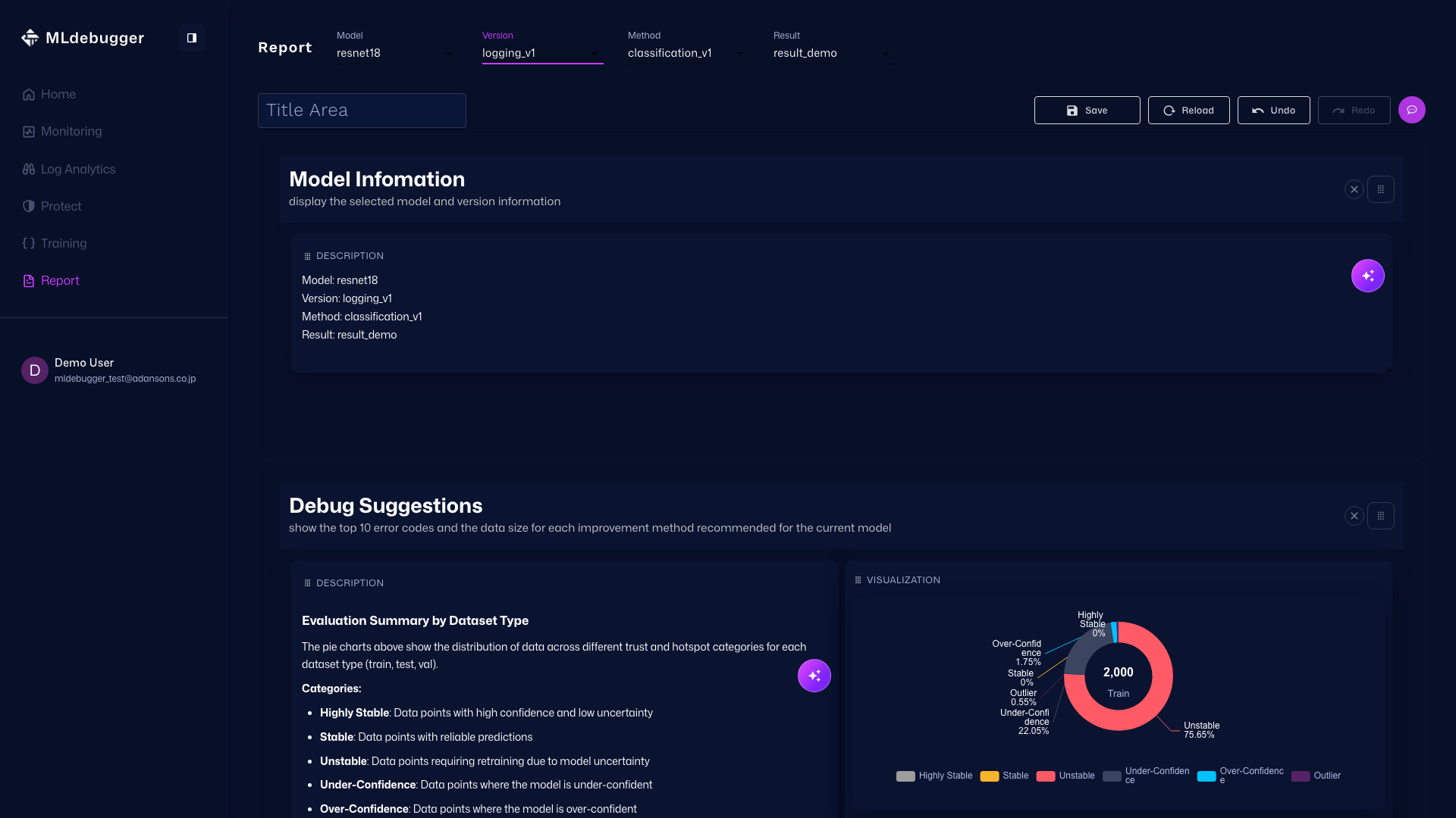 編集内容をPDFとして出力します(ここでは実行せず、UIのみ確認します)。ボタンをクリックすると、レポートがPDFファイルとしてダウンロードされます。