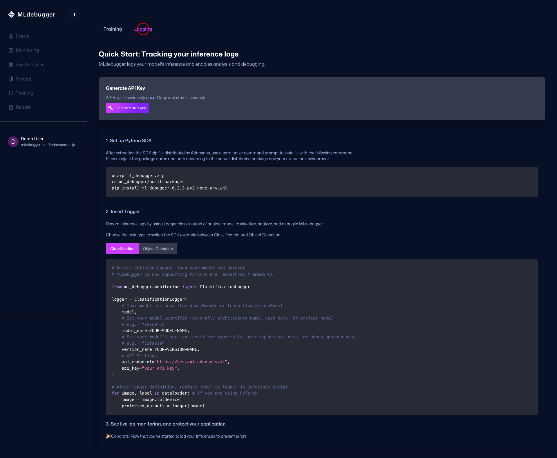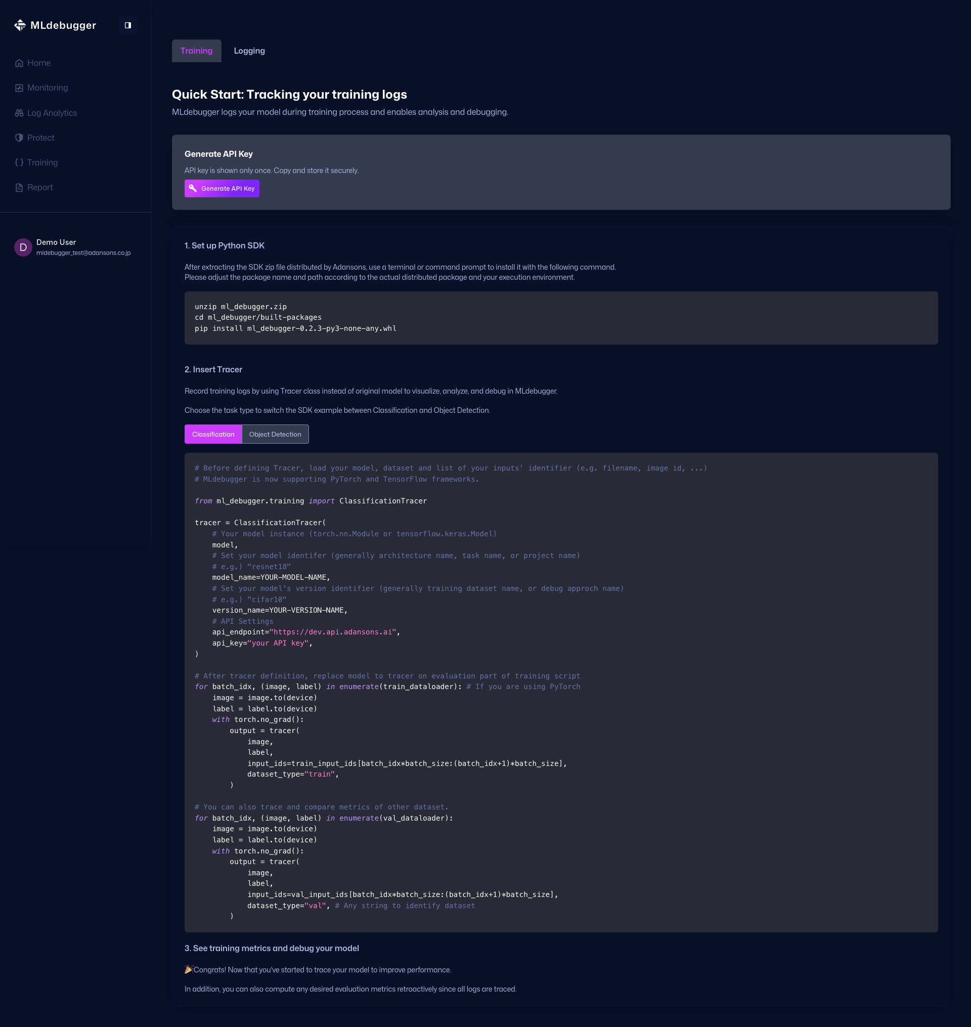 Training / Logging のガイド切り替えと API Key 発行ボタンを提供します。